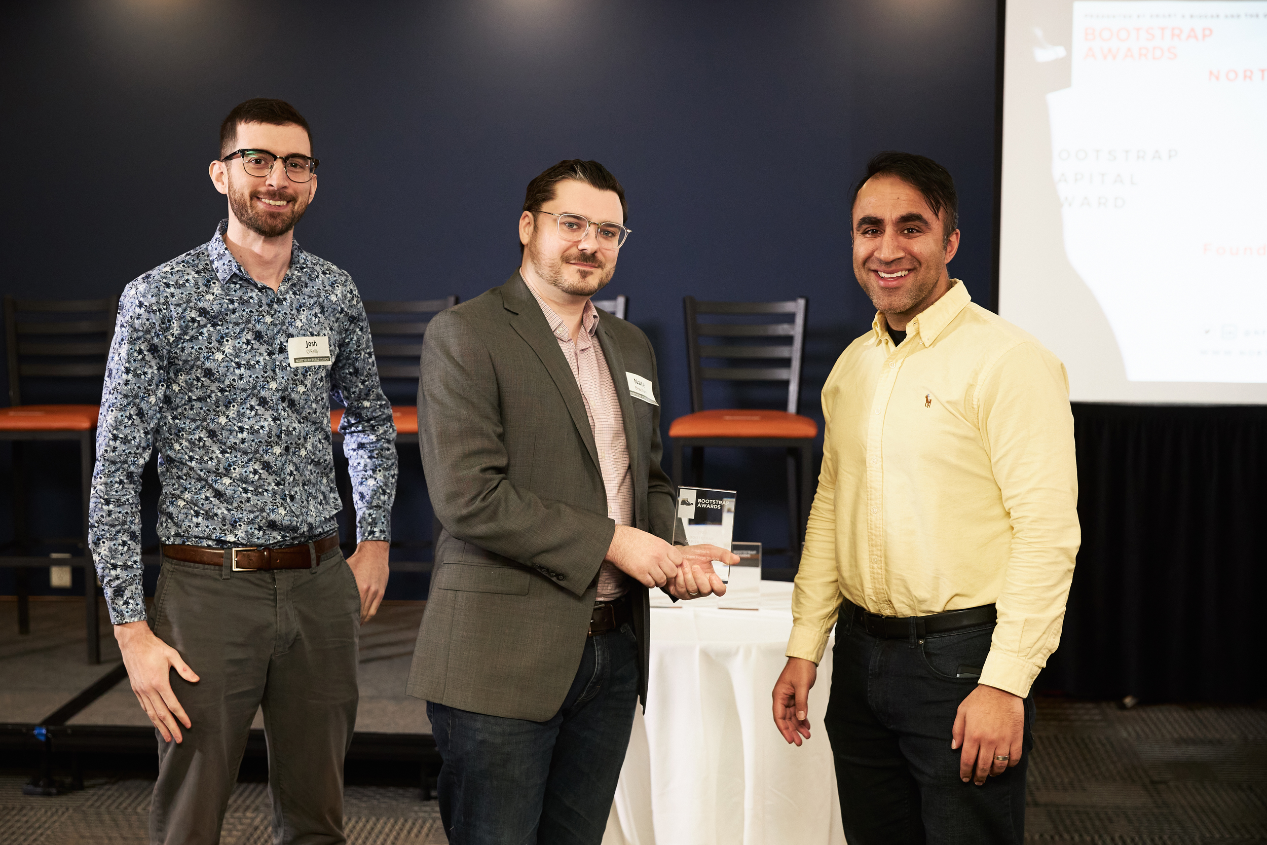 [photo caption: Sarwar Quereshi from Paterson & Company presents Bootstrap Capital Award to Nate Beacham and Jason Flick from Northern Forge Studios]